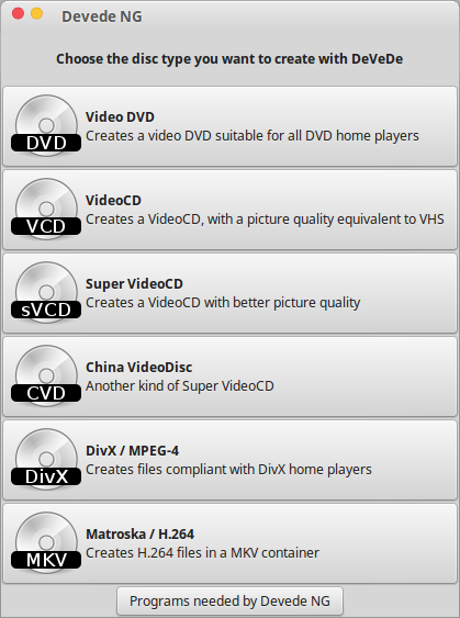 Devede NG is the best linux software to burn any video to video CD/ DVD. With this application you can create a video DVD suitable for all DVD home players, create a video CD with picture quality equivalent to VHS, create files compliant with DivX home mpayers in Linux.