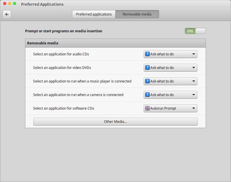 This “Removable media” tab on Linux allow you to configure removable media behavior on Linux Mint. You can also disable auto run program on Linux by make the prompt become OFF.